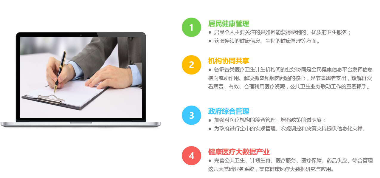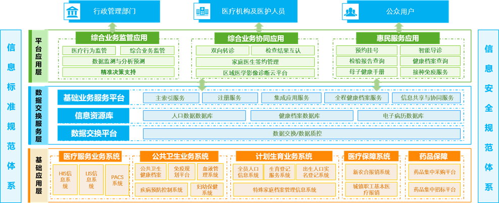 全民健康信息平臺(tái)以國(guó)家“4631-2”框架為依據(jù),根據(jù)國(guó)家衛(wèi)計(jì)委《“十三五”全國(guó)人口健康信息化發(fā)展規(guī)劃》的要求,進(jìn)行全員人口數(shù)據(jù)庫(kù)、電子健康檔案數(shù)據(jù)庫(kù)、電子病歷數(shù)據(jù)庫(kù)的建設(shè),支撐六大類業(yè)務(wù)應(yīng)用(公共衛(wèi)生、計(jì)劃生育、醫(yī)療服務(wù)、醫(yī)療保障、藥品供應(yīng)和綜合管理),實(shí)現(xiàn)惠民、監(jiān)管及協(xié)同服務(wù);實(shí)現(xiàn)與國(guó)家平臺(tái)互聯(lián)互通。